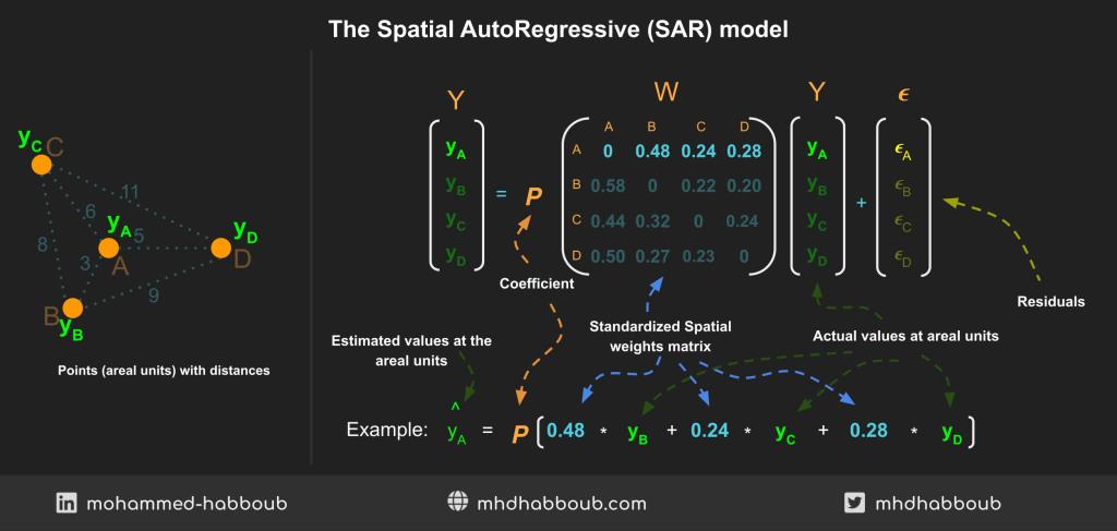 Day 6 of #66DaysOfData. Visualizing the Spatial AutoRegressive (SAR) model. SAR model is one flavour of many spatial regression models .. it is the simplest actually! #DataScience #GeospatialScience