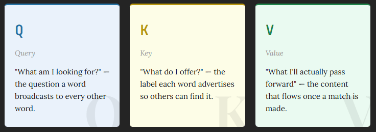 Consider the word “it” in “The trophy didn’t fit in the suitcase because it was too big.” The word “it” asks: “Who am I referring to?” (its Q). Meanwhile, “trophy” advertises: “I’m a physical object with size” (its K). These are completely different directions. Q and K being separate allows this to be learned.