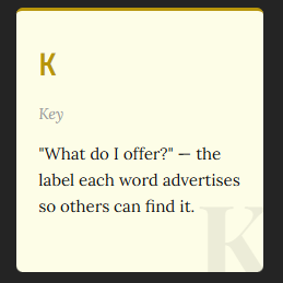 This answer is called the key.. it is an answer to “What do I offer?” .. the label each word advertises so others can find it.