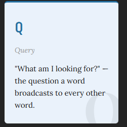 this question is called the Query.. It is “What am I looking for?” question .. The question a word broadcasts to every other word.